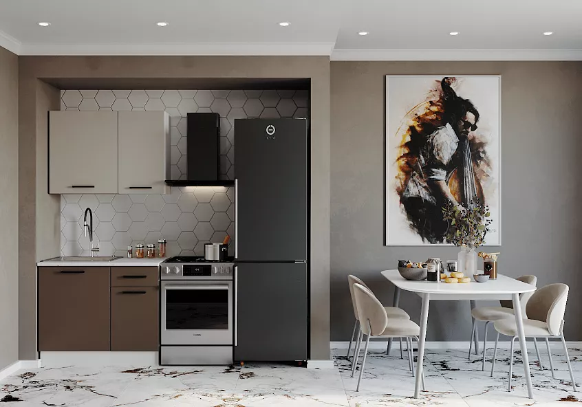 Кухня 1000 мм Верх Корпус: Белый Верх Фасад: Сатин ЛДСП Низ Корпус: Белый Низ Фасад: Мокко ЛДСП Столешница: Мрамор Марквина белый Описание: Корпус ЛДСП 16 мм, кромка ПВХ 0,4 мм. Фасады ЛДСП 16 мм, кромка ПВХ 1мм. Фасады верхних модулей со свесом 12 мм дают возможность использовать без установки ручек. Петли с доводчиком. Навесы внутренние, регулируемые, с декоративной крышкой. Направляющие шариковые полного, плавного выдвижения с нагрузкой до 30 кг. Столешницы цельные с пластиковым покрытием со скруглением по переднему краю (постформинг толщина 26/38 мм). Регулируемые ножки-опоры.