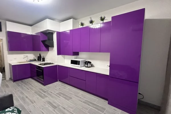 Эта большая угловая кухня в стильном фиолетовом цвете — настоящее произведение искусства. Современный дизайн, глянцевые фасады и изысканная фурнитура создают неповторимый шарм. Просторная рабочая поверхность и продуманная система хранения делают процесс приготовления пищи максимально комфортным. Фиолетовый оттенок добавляет кухне индивидуальности и превращает ее в яркий акцент Вашего интерьера. Эта кухня идеально подходит для тех, кто ценит красоту, стиль и не боится смелых решений.