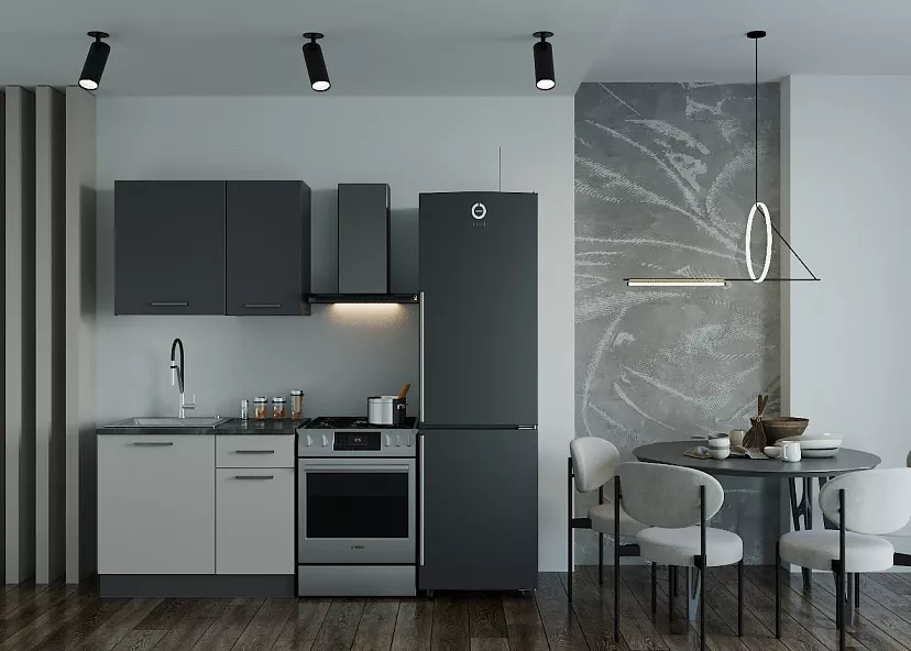 Кухня 1000 мм Верх Корпус: Антрацит Верх Фасад: Антрацит ЛДСП Низ Корпус: Антрацит Низ Фасад: Сатин ЛДСП Столешница: Детройт Описание: Корпус ЛДСП 16 мм, кромка ПВХ 0,4 мм. Фасады ЛДСП 16 мм, кромка ПВХ 1мм. Фасады верхних модулей со свесом 12 мм дают возможность использовать без установки ручек. Петли с доводчиком. Навесы внутренние, регулируемые, с декоративной крышкой. Направляющие шариковые полного, плавного выдвижения с нагрузкой до 30 кг. Столешницы цельные с пластиковым покрытием со скруглением по переднему краю (постформинг толщина 26/38 мм).