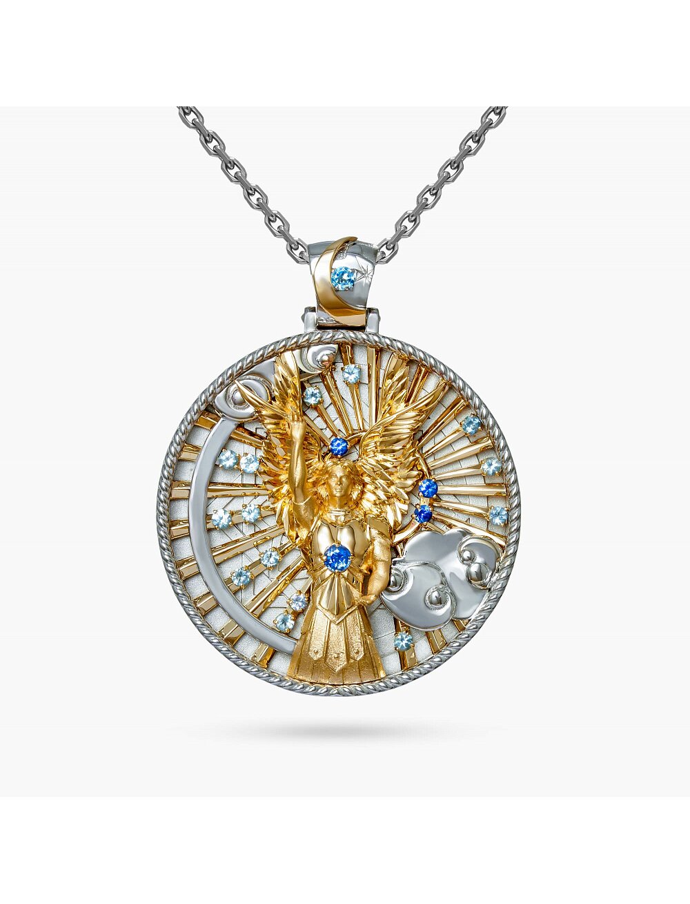 Кулон Бог Солнца - это мощный оберег и талисман, воплощающий солнечную энергию, свет и жизнь. Он защищает от сглаза, порчи и негатива, укрепляет дух и тело, приносит владельцу удачу, процветание, успех и радость. Часто ассоциируется с Ярило (у славян) или индейскими культами, даруя храбрость, жизненные силы и гармонию. Подпитывает жизненными силами, повышает креативность и работоспособность. Привлекает финансовое благополучие, гармонию в отношениях и удачу. Металл - золото 585 пробы. Вставки: синие сапфиры, топазы. Вес - 47,9 гр. Диаметр - 4,0 см.