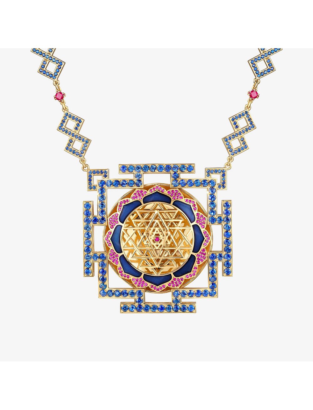 Кулон Шри Янтра - это мощный оберег и священный геометрический символ из индуизма, представляющий собой девять переплетенных треугольников, образующих 43 малых треугольника вокруг центральной точки (бинду). Он символизирует гармонию мужского и женского начал, богиню процветания. Считается, что он гармонизирует пространство, притягивает удачу, финансовое благополучие и способствует карьерному росту. Металл - желтое золото 750 пробы. Вставки: рубины, синие сапфиры, танзаниты. Вес изделия - 150 гр.