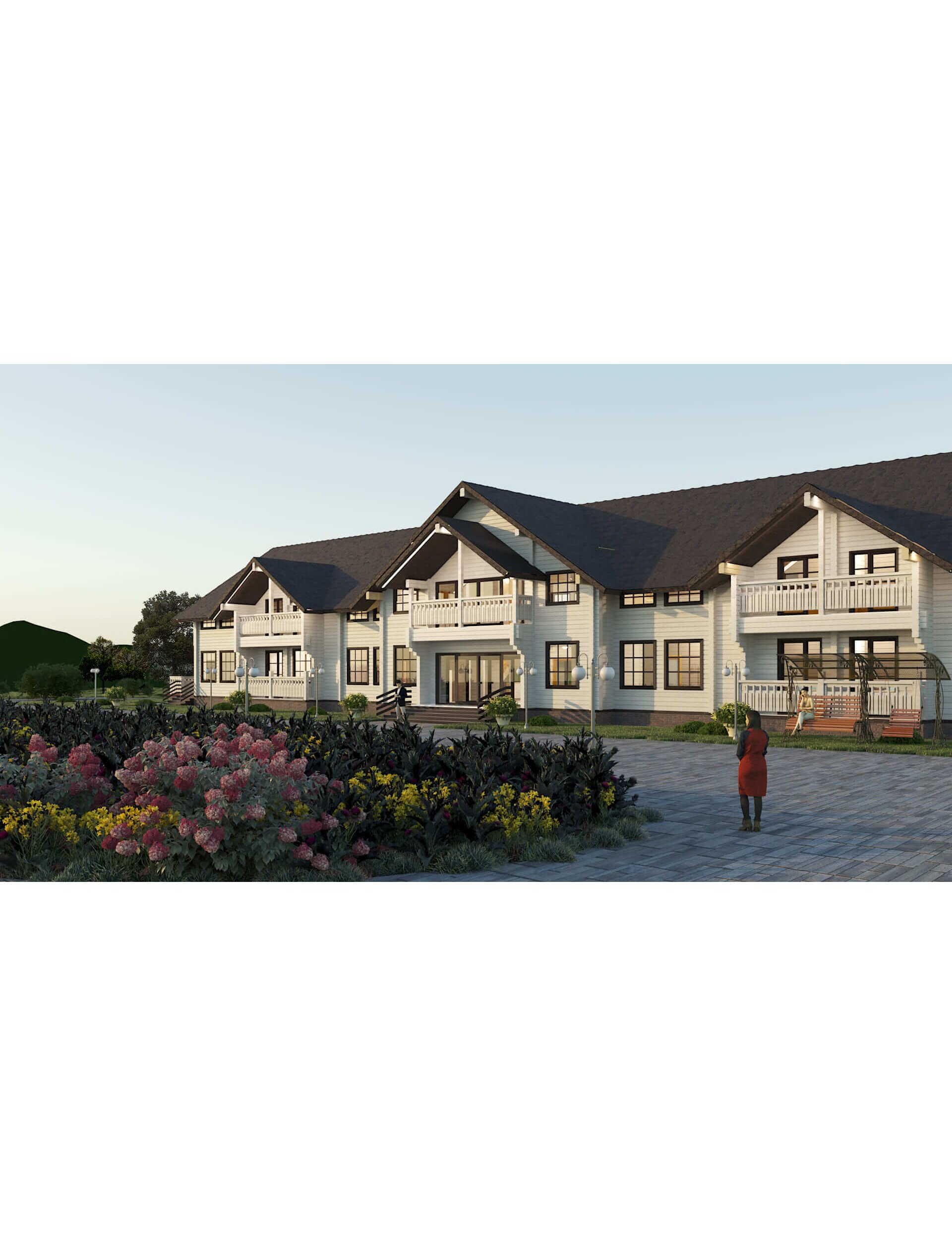 Загородный корпус расположен в предгорьях Алтая, на берегу озера, и полностью выполнен из клеёного бруса. Общая площадь здания составляет 1430,4 кв. м, а внутри находятся 19 номеров на двух этажах.