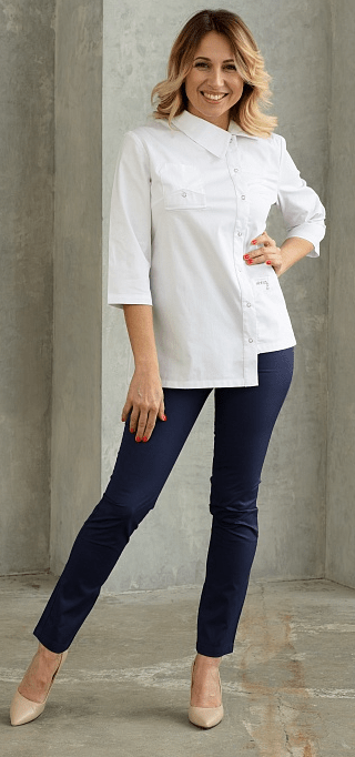 Необычная медицинская блуза A118 поможет создать классический, но в тоже время современный медицинский образ. Стильная медицинская блузка с асимметричным кроем отлично сочетается с брюками нашего бренда. Для создания классического медицинского костюма мы рекомендуем подобрать к модели зауженные к низу брюки от CAPRIZNAYA MODA. Эта модель оригинальная, интересная и позволяет создавать разнообразные профессиональные образы
