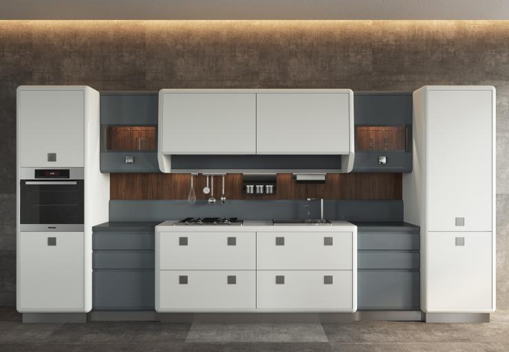 Функциональность и минимализм — это икона стиля. Такой выглядит кухня «Айкон». Современная техника органично спрятана за эмалированными поверхностями. Полки открываются одним прикосновением. Интересно смотрится матовый шпон американского ореха на контрасте с глянцевой отделкой фасадов. Почти плоские накладные ручки-кнопки в отделке хром-глянец дополняют игру металла вместе с рабочей зоной и мойкой.
