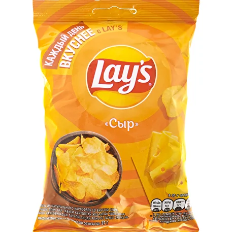 Хрустящие золотистые чипсы Lay`s со вкусом сыра – это отличное сочетание отборной картошки, растительного масла и сыра. Лейс Сыр – настоящее удовольствие для всей семьи! Тонкие хрустящие чипсы LAY`S золотистого цвета имеют выраженный вкус сыра, который приобретают благодаря добавлению ароматических веществ. Чипсы Лейс быстро утоляют чувство голода, поэтому подходят для перекуса в течение дня. LAY`S удобно брать с собой в дорогу, на прогулку или на занятия. Чипсы Лейс можно использовать в кулинарии при приготовлении салатов и закусок. Вакуумная упаковка Лейс способствует сохранности продукта без дополнительных консервантов.