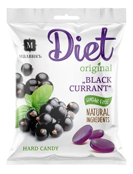 Состав: подсластитель — изомальт, сироп мальтозный, регулятор кислотности — кислота лимонная, подсластитель — стевиозид, ароматизатор натуральный (чёрная смородина), краситель пищевой натуральный (антоцианы).