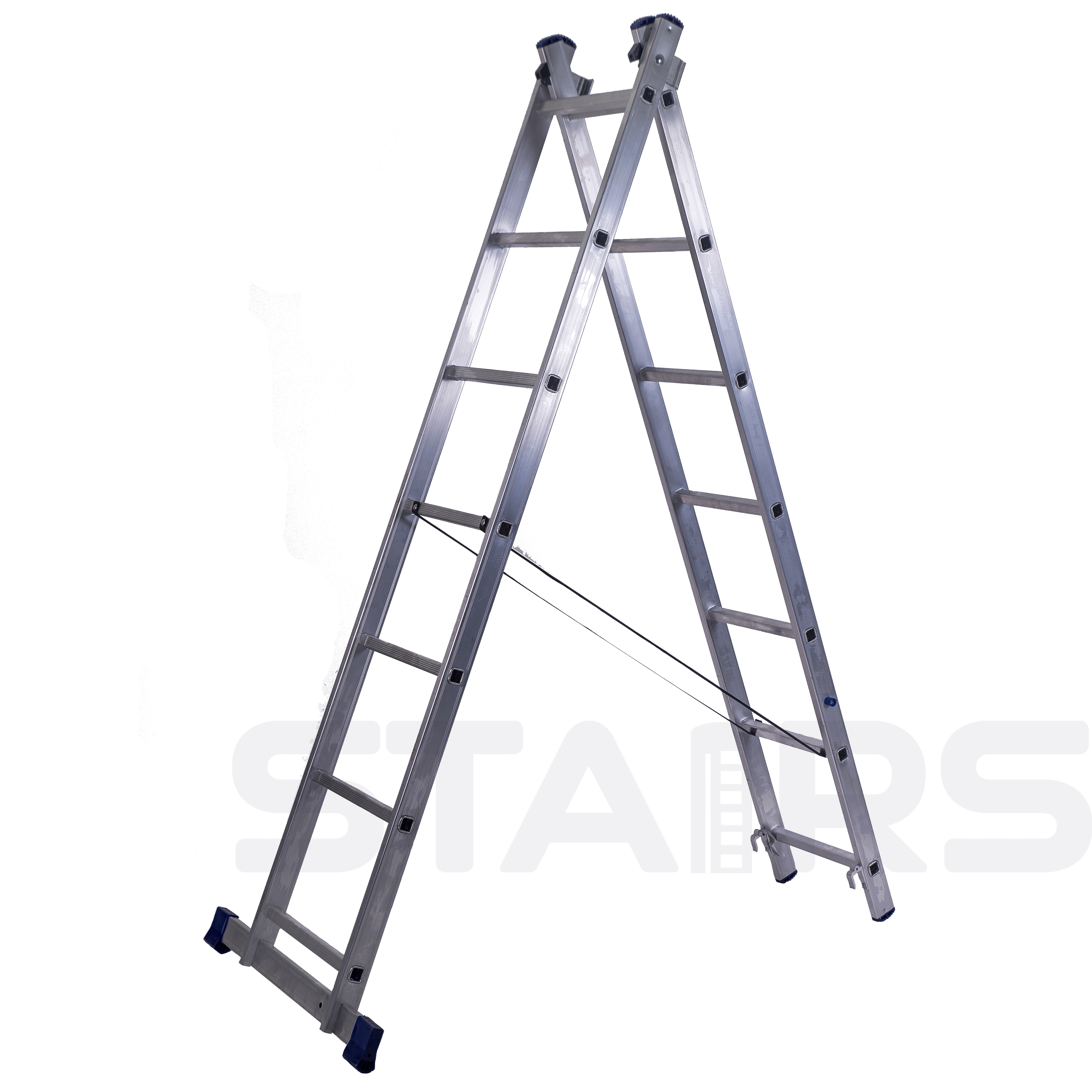 Лестница из двух секций многофункциональна. Лестницу можно использовать в качестве стремянки и раздвижной лестницы. Алюминиевый сплав делает лестницу легкой, но при этом прочной за счет увеличенной износостойкости материала. Алюминий не подвержен коррозии, что позволяет использовать лестницу как в помещении, так и на открытом пространстве.
