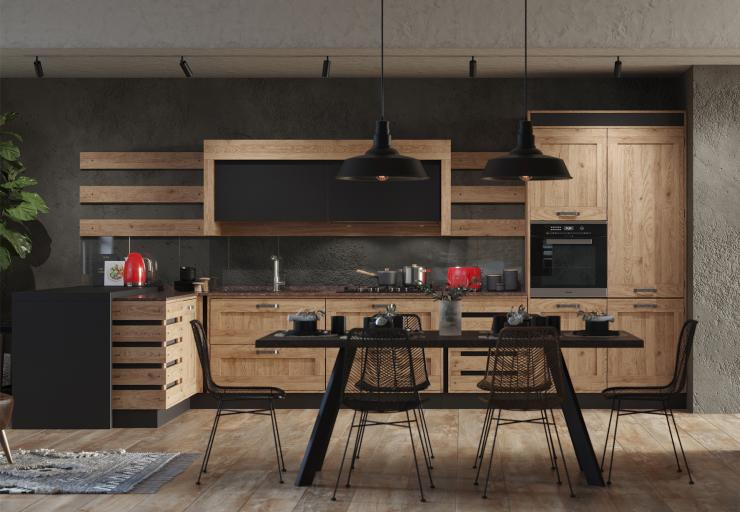 Кухня «Лофт» заметна объемными фасадами с рамками. В интерьер добавлены открытые полки с подсветкой, куда так и хочется поставить баночки с конфетами, крупами и специями. В пространстве появляются необычные грифельные доски – на таких ещё в прошлом веке писали самые лучшие рецепты в кафе – модное решение сегодняшнего дня.