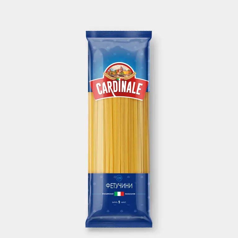 Макароны в форме тонких, плоских полосок из твердых сортов пшеницы. Мука из твердых сортов пшеницы позволяет производить высококачественные макаронные изделия группы А европейского стандарта. Она отличается от обычной хлебопекарной тем, что содержит много белка, углеводы, Na, K, Р, Ca, Mg, Fe, витамины В1, В2, PP, имеет низкое содержание жиров и крупитчатую структуру. Пшеницу для макаронных изделий собственной торговой марки Cardinale «KDV-Агро» выращивает на экологически чистых полях Алтая. Макароны по итальянской рецептуре произведены на современной автоматизированной линии – на таких же работают фабрики в Италии. Прекрасно подходят для приготовления пасты с различными соусами – мясными, овощными или с морепродуктами. – Макароны-фетучини отлично гармонируют с сыром и морепродуктами, например креветками. При подаче такую пасту можно украсить красной икрой.