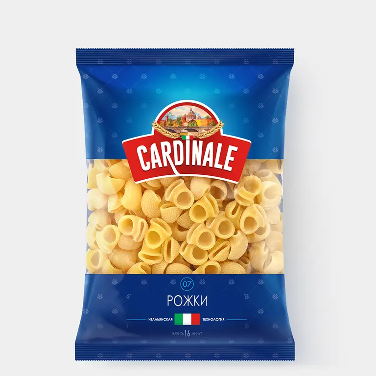 Макароны из отборной пшеницы твердых сортов. Мука из твердых сортов пшеницы позволяет производить высококачественные макаронные изделия группы А европейского стандарта. Она отличается от обычной хлебопекарной тем, что содержит много белка, углеводы, Na, K, Р, Ca, Mg, Fe, витамины В1, В2, PP, имеет низкое содержание жиров и крупитчатую структуру. Пшеницу для макаронных изделий собственной торговой марки Cardinale «KDV-Агро» выращивает на экологически чистых полях Алтая. Макароны по итальянской рецептуре произведены на современной автоматизированной линии – на таких же работают фабрики в Италии. Рожки подойдут для вторых блюд или в качестве гарнира к мясу, рыбе или овощам. – Рожки можно использовать для приготовления пасты или теплых салатов.