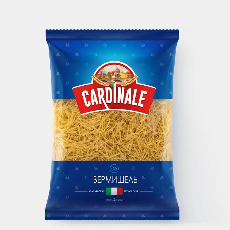 Макароны из отборной пшеницы твердых сортов. Мука из твердых сортов пшеницы позволяет производить высококачественные макаронные изделия группы А европейского стандарта. Она отличается от обычной хлебопекарной тем, что содержит много белка, углеводы, Na, K, Р, Ca, Mg, Fe, витамины В1, В2, PP, имеет низкое содержание жиров и крупитчатую структуру. Пшеницу для макаронных изделий собственной торговой марки Cardinale «KDV-Агро» выращивает на экологически чистых полях Алтая. Макароны по итальянской рецептуре произведены на современной автоматизированной линии – на таких же работают фабрики в Италии. Вермишель подойдет для первых и вторых блюд. – Любители классики могут приготовить традиционный куриный бульон с вермишелью. – Вегетарианцы добавить вермишель в турецкий овощной суп с нутом.