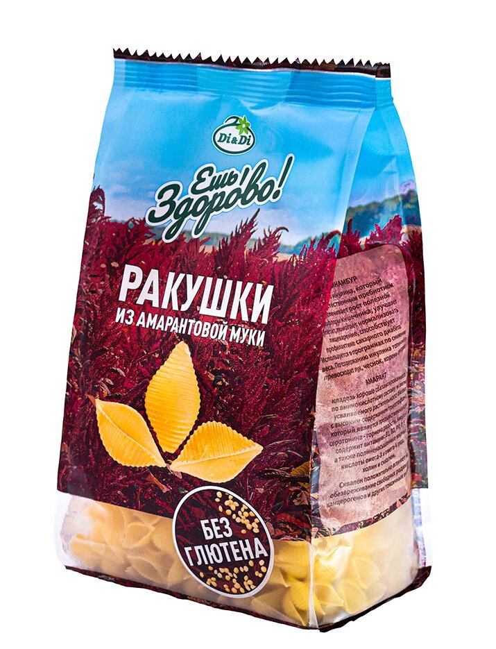 Макаронные изделия Ракушки БЕЗ ГЛЮТЕНА производятся по уникальному рецепту из кукурузной и амарантовой муки, с добавлением топинамбура. Высокое содержание аминокислот, кальция, волокон и растительного белка, делают макароны «Ешь ЗдорОво» незаменимым помощником при соблюдении диеты. Идеально сочетаются с томатным соусом и соусом песто.