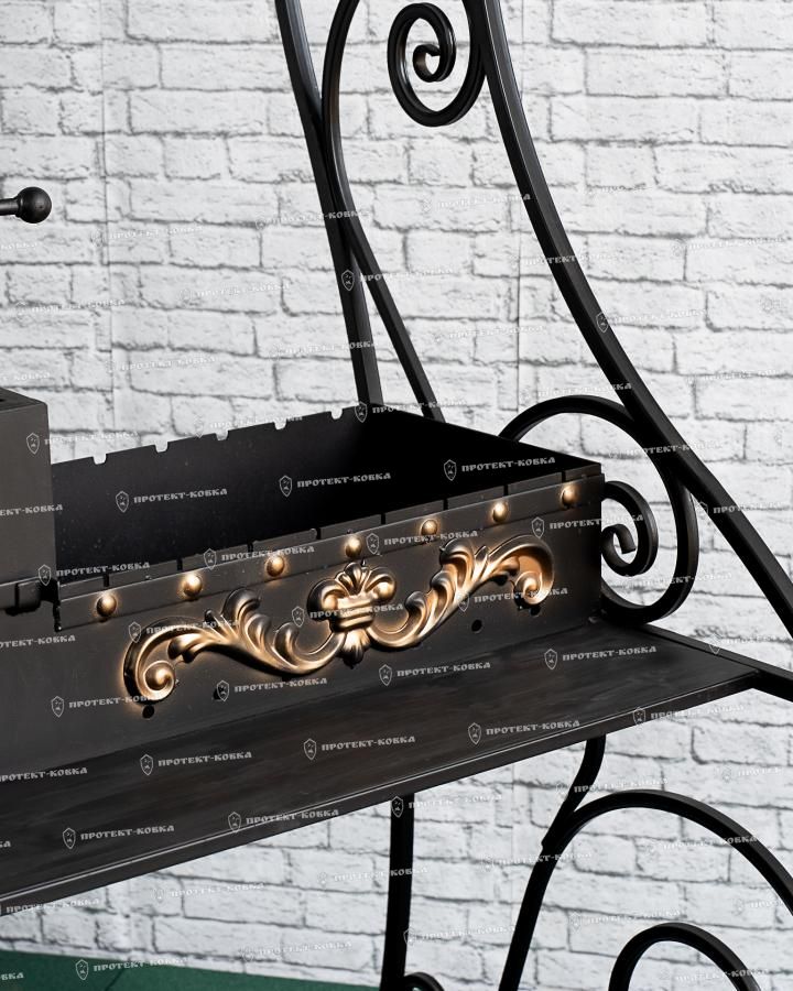 Размер1040*1500*2350 мм (Ш*Г*В) Размер жаровни1000*350*150 мм (лист - 3 мм) Размер печи420*350*300 мм (лист - 3 мм) Вес99.5 кг Мангал под крышей серии «Арес» — это многофункциональная стационарная конструкция, выполняемая мастерами Протект Ковка в виде кованного окрашенного каркаса с художественными элементами декора. В конструкции мангала предусматривается печь-подставка для казана и сам мангал. Мангал с крышей дополнительно оснащен небольшой металлической столешницей и нижними полками для дров. Встроенный дымоход обеспечит отвод дыма от места готовки, делая приготовление любимых мясных блюд наиболее комфортным. Округлый козырек надежно защищает жаровню и стол от внезапного дождя, поэтому готовить любимые блюда вы сможете в любую погоду.