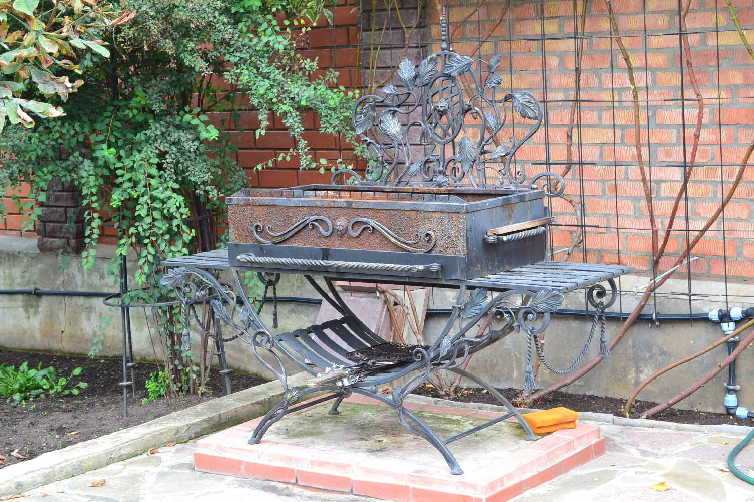 Мангал с ковкой 790 - стационарный кованый мангал, с кованым орнаментом из дубовых листьев и желудей. Устанавливается на территории дачи, частного владения, загородного дома, усадьб. Этот мангал имеет две подставки под разделочную доску и кастрюлю. Под самим мангалом полочка для дров или для посуды.