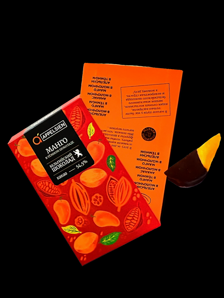 Состав: Изделия кондитерские сахаристые. Манго в тёмном шоколаде. Состав: манго сушеный натуральный с сахаром (листики), тёмный шоколад (какао тертое, сахар, масло какао, эмульгатор: лецитины (соя), натуральный ароматизатор (ваниль)). Массовая доля общего сухого остатка какао - не менее 40%. Массовая доля масла какао - не менее 20%. Изготовлено по ТУ 10.82.22-001-19709824-2017.