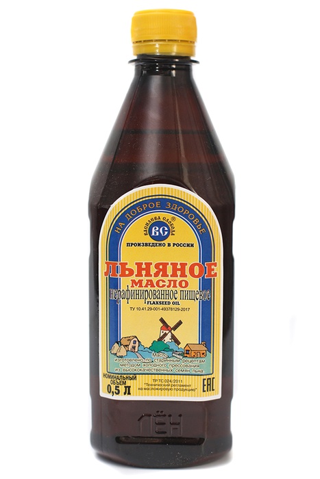 Масло льняное пищевое 0,5 л. ПЭТ самый богатый растительный источник полиненасыщенных жирных кислот Омега-3 и Омега-6. 100% натуральное нерафинированное масло, полученное по старинным рецептам методом холодного отжима. В составе этого масла содержится множества витаминов и минеральных веществ: витамины группы В, цинк, лецитин, магний, калий, витамины А, F, E. Все вместе эти витамины оказывают благоприятное воздействие на организм человека, очень важно кушать его в периоды стресса, авитаминоза, будет полезно беременным женщинам и поможет в восстановлении после любых болезней.Льняное масло хорошо стимулирует эндокринную систему, защищает и восстанавливает сосуды и помогает работе сердца. Снижает уровень холестерина в крови и риск образования тромбов, сужения сосудов. Рекомендуют в восстановительных диетах после перенесенных инфарктов и инсультов.Льняное масло полезно детям. Оно благоприятно влияет на развитие и деятельность мозга и остальных органов. При недостатке незаменимых аминокислот, ребенку будет сложнее учиться и усваивать информацию.Льняное масло помогает нормализовать обмен веществ, что способствует похудению, и является источником здорового пищеварения. Устраняет изжогу и запоры, благоприятно действует на слизистые кишечника, рекомендовано при гастритах и многих других заболеваниях ЖКТ. Стимулирует деятельность головного мозга, а также снижает риск заболевания атеросклерозом. Способствует очищению кровеносной системы, выведению шлаков и токсинов.