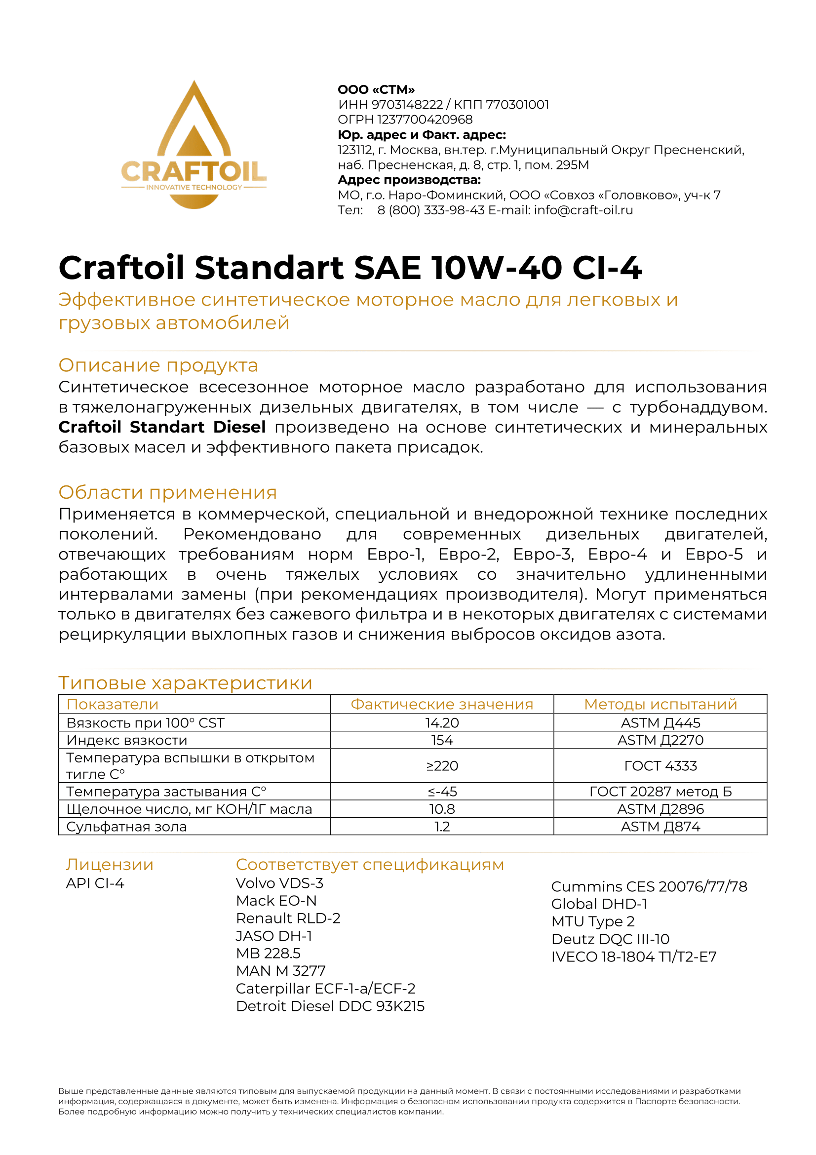 Craftoil Standart Diesel произведено на основе синтетических и минеральных