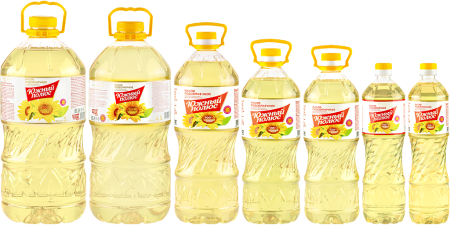 Подсолнечное масло «Южный полюс» фасуется в ПЭТ-бутылки объемом 0.9л, 1л, 1.8л, 2л, 2.7л, 4.5л и 5 литров.