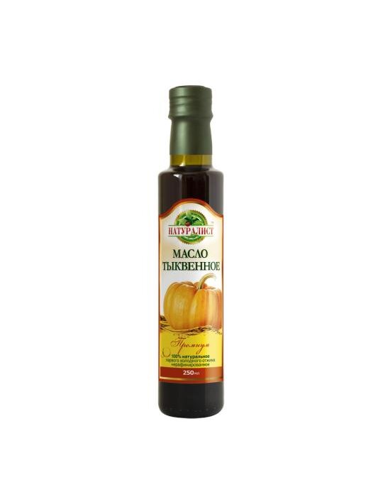 Масло тыквенное из семян штирийской тыквы Натуралист 100% натуральное нерафинированное первого холодного отжима. Ёмкость 250 мл. Тыквенное масло “Натуралист” производится из отборных семян австрийского сорта тыквы масляной штирийской, семечки которой от природы не покрыты кожурой — голосемянные. Получается исключительно из ядер тыквенных семечек без кожуры и лишних примесей. Поэтому оно такое чистое, обладает нежным бархатистым вкусом. Первый холодный отжим и никакой обжарки! Это масло вырабатывается на прессах механическим способом, методом первого холодного отжима. Чтобы максимально сохранить все полезные свойства, семена тыквы используются без предварительной обжарки. Гарантируем чистый натуральный вкус. Продукция «Натуралист» не содержит консервантов, красителей, искусственных добавок, ГМО. Вырабатывается без предварительной обжарки семян, без добавления соли.