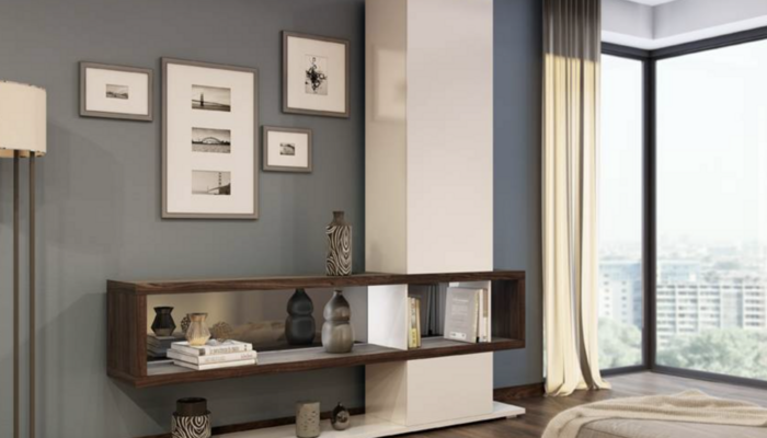 стеллажи и открытые полки — размещение книг, растений, фоторамок, декора.