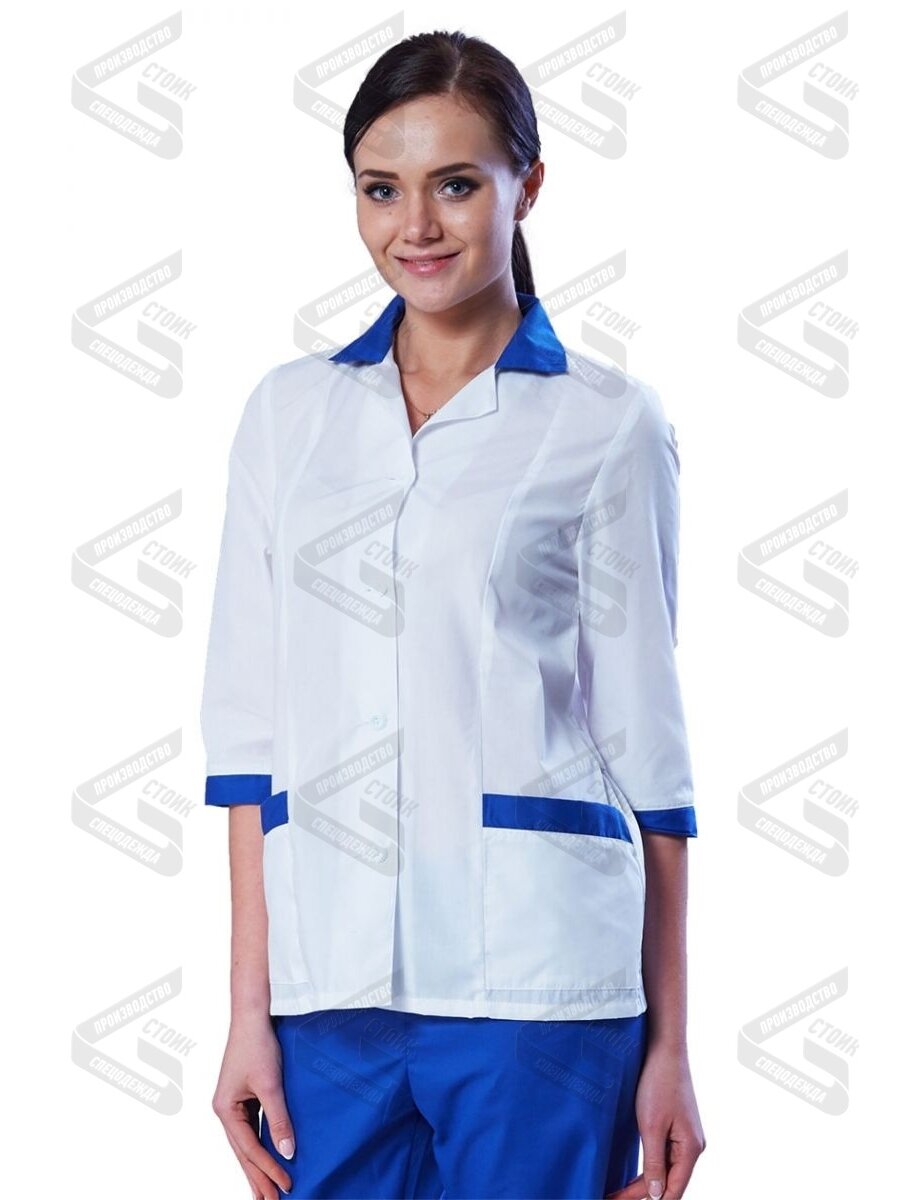 Медицинский костюм "Стандарт" женский. Блузка с центральной бортовой застежкой на пуговицы. Полочки с рельефами от линии плеча, с двумя нижними накладными карманами. Верхние срезы карманов обработаны контрастной отделкой. Спинка с хлястиком, втачанным в боковые швы. Воротник отложной, с лацканами. Верхний воротник контрастного цвета. Рукава втачные одношовные, с отделочными василькового цвета.Брюки василькового цвета, с поясом на резинке.