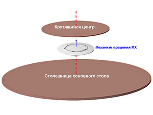 Большая площадь опоры позволяет установить на механизм круглую столешницу диаметром до 140-150 см. Нагрузка на механизм MX до 50 кг Механизм крепим к поворотному кругу снизу. Получаем готовый крутящийся центр стола