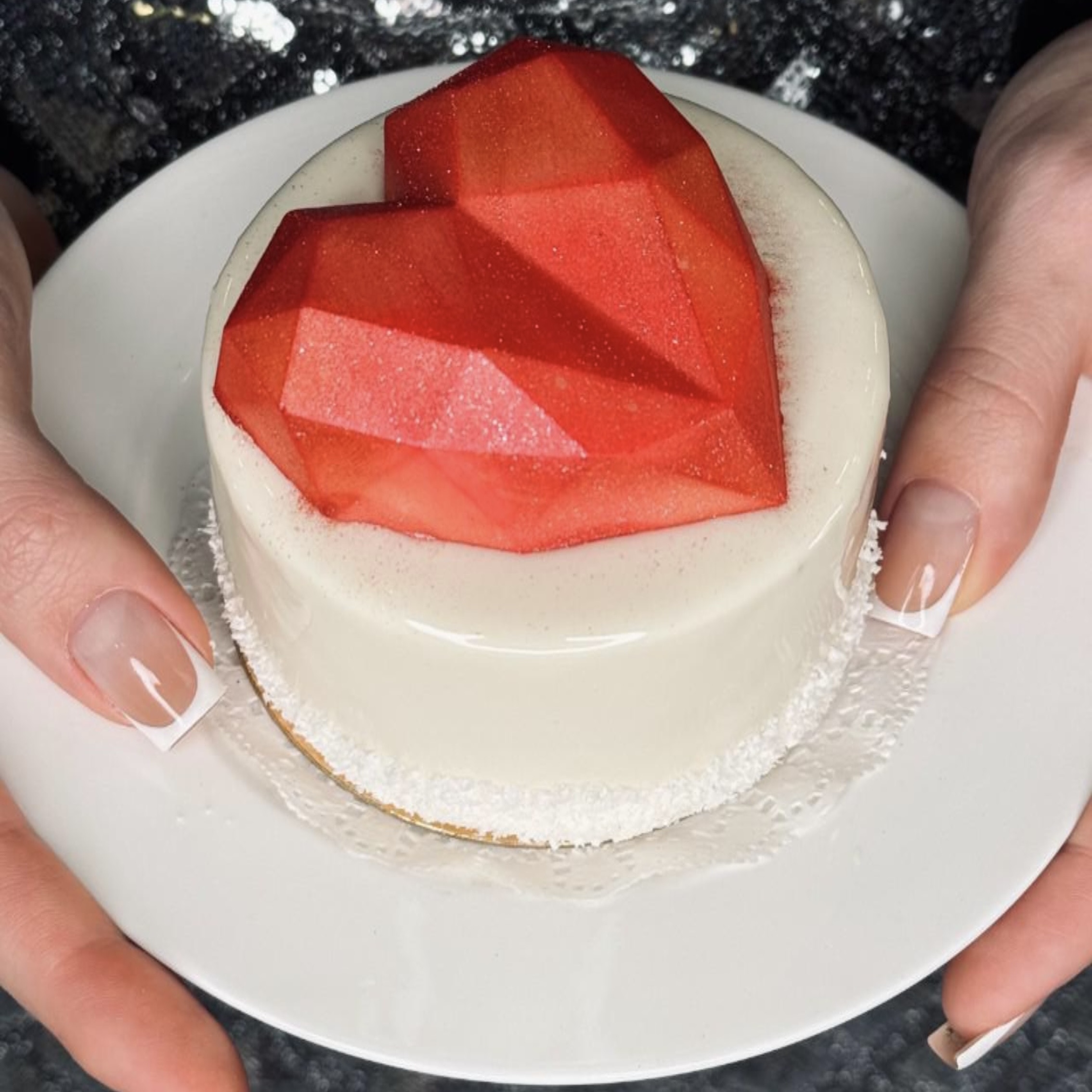 Мини муссовый бенто на основе белого бельгийского шоколада добавлением натурального пюре манго и маракуйи c изображением на сахарной бумаге и декором из шоколадного сердца. В подарочной упаковке.