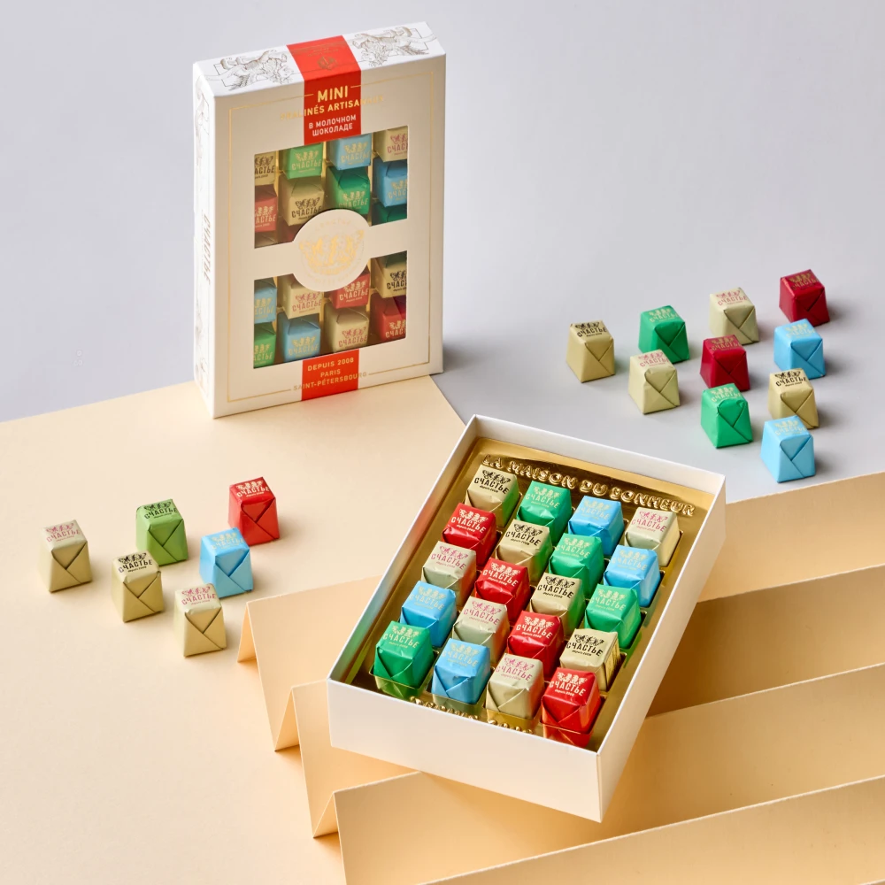 Коллекция мини-пралине 20 шт ассорти в молочном шоколаде от конфетной фабрики «Счастье», созданными вручную по уникальному рецепту 2008 года.