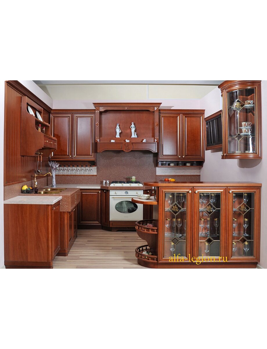 Категория: Классическая кухня Материал: Фасад из массива Бука Цвет: Эксклюзивный каталог RAL WOOD COLOR PLUS Виды стекла: Витражи Листовое стекло Столешницы: Российские Итальянские