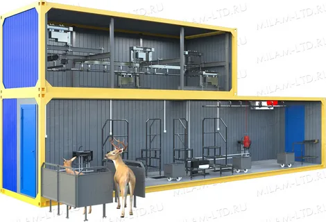 Модуль для убоя скота основного производства двухуровневый предназначен для убоя и первичной переработки скота производительностью до 3-х тн. товарного мяса на костях и сопутствующих субпродуктов в 8-ми часовую рабочую смену (в пересчете на головы животных: до 15 голов КРС, до 40 голов свиней или 75 голов МРС в смену). Цех из модулей устанавливается на предварительно подготовленную площадку для их установки и коммутации. Срок изготовления и поставки модульно цеха для убоя и первичной переработки скота – до 90 дней с момента поступления предоплаты.