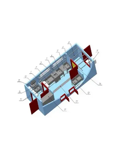 Снаружи модуль облицован оцинкованным профнастилом, утеплитель – пенополиуретан, толщина стенок – 100 мм. Внутренняя отделка: стены, потолок – лист нержавеющий; пол – алюминиевый рифленый лист.