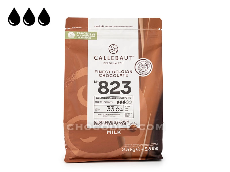 Бельгийский шоколад Callebaut 823 имеет средний уровень текучести (3 капли), потому его можно использовать для домашних фонтанов. Для работы с профессиональными шоколадными фонтанами лучше добавить в шоколад какао-масло (100 гр. масла на 2.5 кг. шоколадной основы).