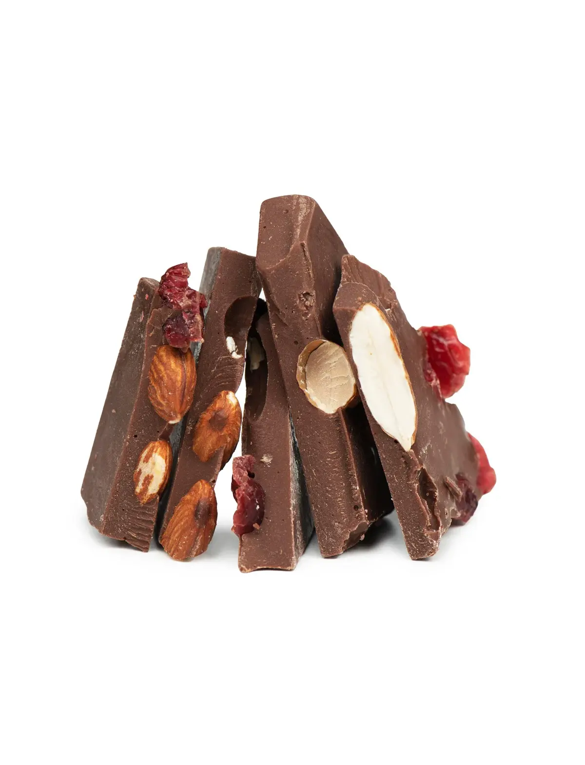 Слегка кислая и сладковатая клюква приятно проступает на ровном фоне из молочного шоколада и обжаренного миндаля.