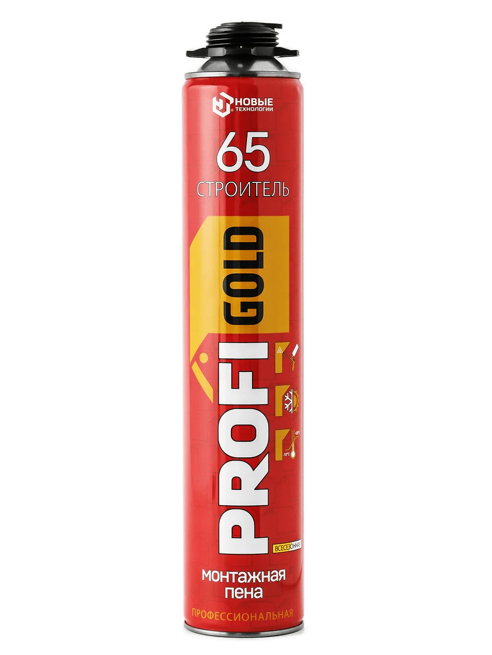 Монтажная пена PROFIGOLD 65 СТРОИТЕЛЬ ВСЕСЕЗОННАЯ высококачественная однокомпонентная полиуретановая монтажная пена в аэрозольной упаковке для профессионального (для работы пистолетом с аппликатором) применения, затвердевающая под действием влаги воздуха.Обладает превосходной адгезией к большинству строительных поверхностей, кроме тефлона, силикона, полипропилена и полиэтилена.Затвердевшая пена не ухудшает свои качества в процессе старения, но подвергается разрушению под действием УФЛ-излучения и атмосферных осадков.