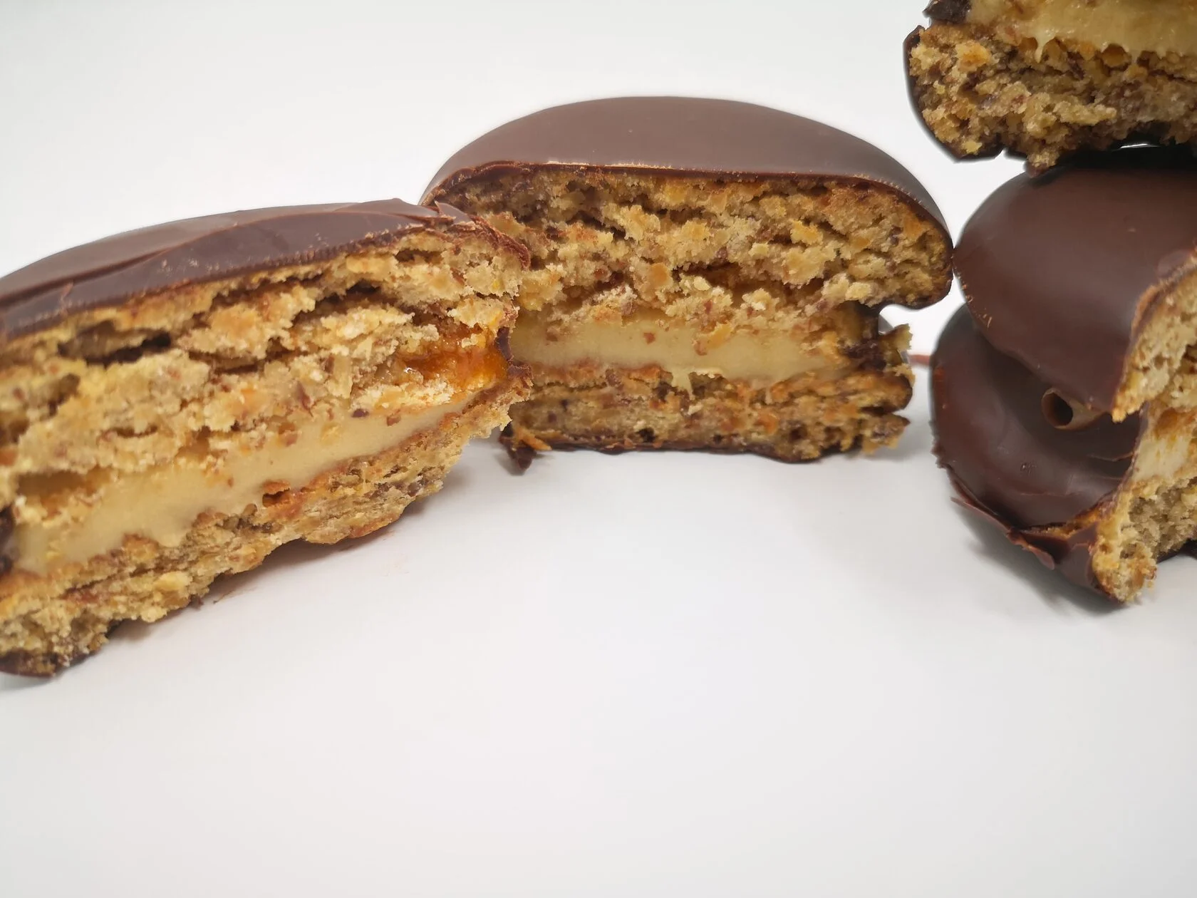 Два мягких миндальных бисквита с морковью, густая нуга, вываренная облепиха и тонкий слой шоколада!