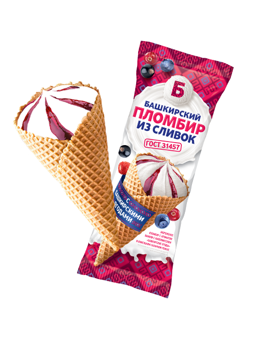 Мороженое «Башкирский пломбир из сливок» с ароматом ванили с топпингом «башкирский ягоды» в вафельном сахарном рожке