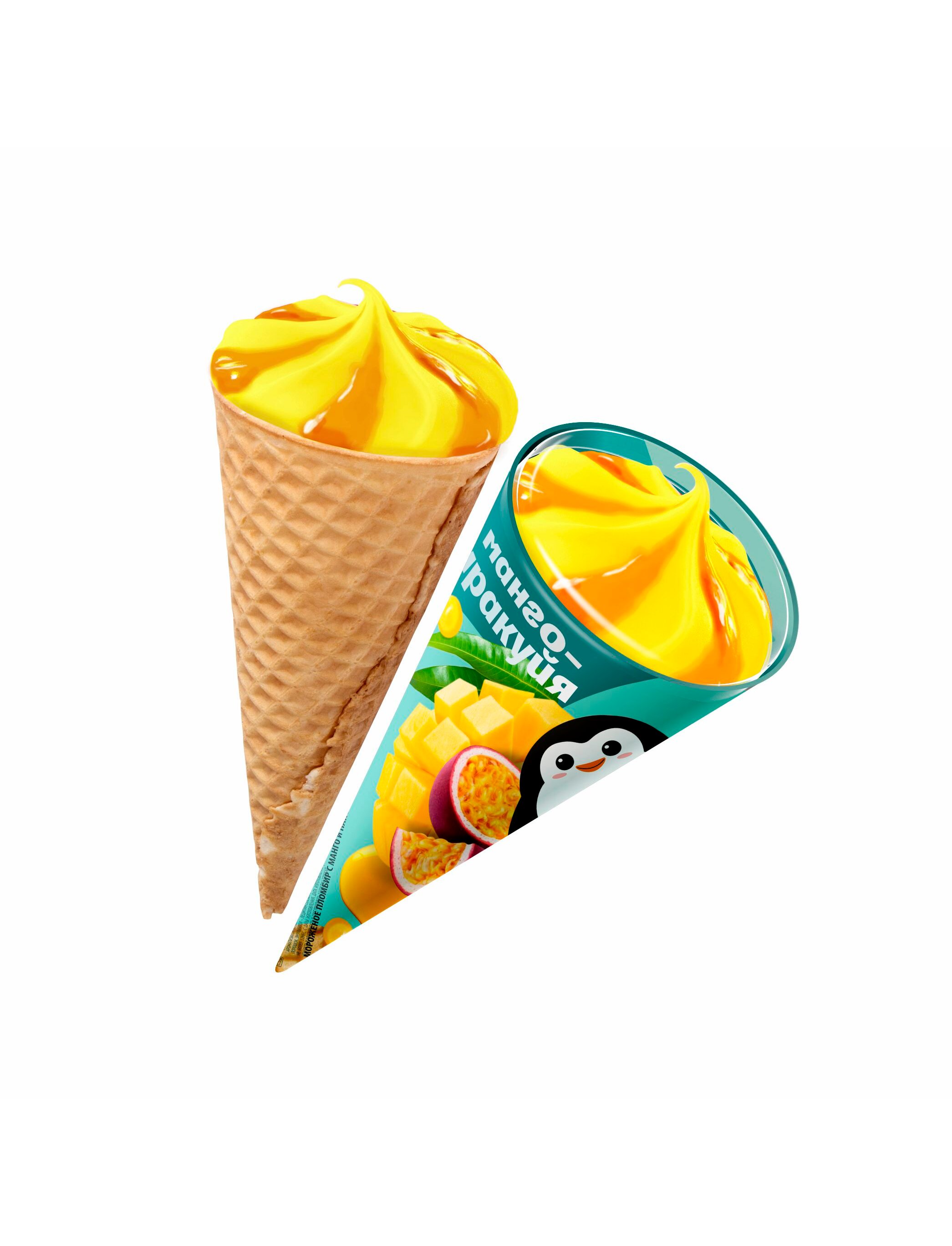 Пломбир с манго и джемом из маракуйи в вафельном сахарном глазированном рожке.