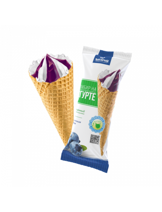 Сахарный рожок пломбир на йогурте с черничным джемом.