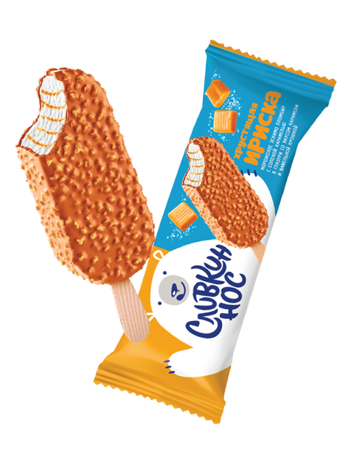 Мороженое «Сливкин нос» пломбир с ароматом ириски с соленой карамелью в карамельной глазури с вафельной крошкой