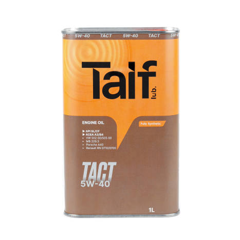 Моторное масло TAIF TACT 5W-40 SL/CF, A3/B4 (1 литр) - это высококачественное всесезонное моторное масло, разработанное на основе синтетических технологий, предназначенное для использования в бензиновых и дизельных двигателях легковых автомобилей, микроавтобусов и легкого коммерческого транспорта.Моторные масла для современных бензиновых и дизельных двигателей легковых автомобилей, в том числе оборудованных турбонаддувом. Масло обеспечивает легкий запуск двигателя при отрицательных температурах и надежную толщину масляной пленки при интенсивных режимах эксплуатации. Наличие в составе композиции моюще-диспергирующих присадок предотвращает образование высоко- и низкотемпературных отложений, сохраняя чистоту двигателя. Стабильность свойств на весь период эксплуатации.