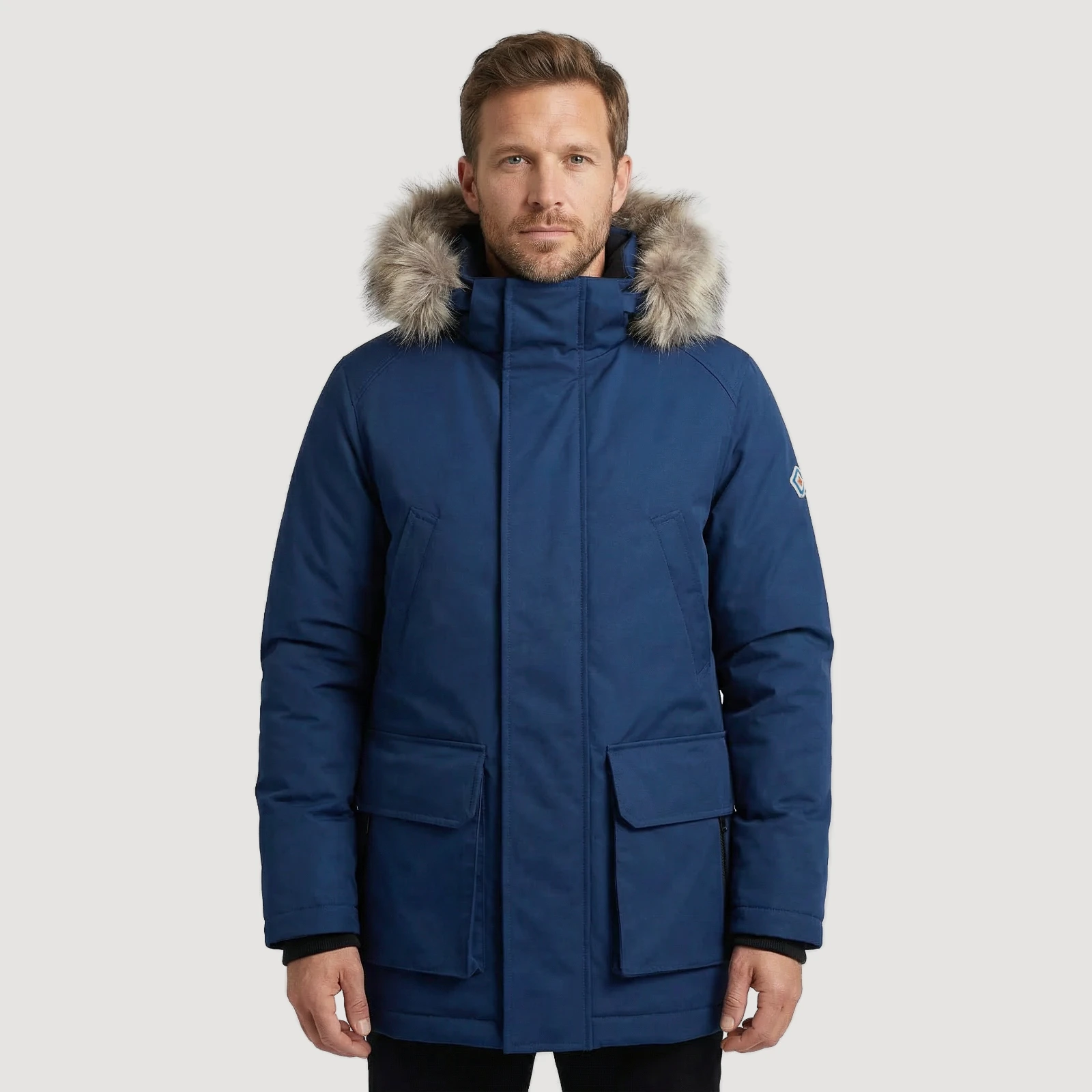 Мужская зимняя парка Extreme Winter Siberia синяя классическая мужская зимняя парка разработана для защиты от сильных морозов. Плотная износостойкая ткань верха содержит хлопок, остаётся мягкой и эластичной при низких температурах, устойчива к реагентам и нефтепродуктам, легко стирается. Лёгкий утеплитель из ультратонких волокон создаёт воздушную прослойку, которая эффективно удерживает тепло и сохраняет свои свойства после многократных стирок и активной носки.Функциональные особенности:трикотажные воротник и манжеты;утеплённые нижняя и верхняя планки на «липучках»;ветрозащитная «юбка»;регулируемый по высоте съёмный капюшон с отстёгивающейся меховой опушкой;десять карманов (два нагрудных, два двойных накладных, четыре внутренних кармана на молниях).