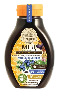 Мягкий натуральный мед с прополисом + 12 трав и пряностей МОЖЖЕВЕЛОВЫЙ "Столбушино" Премиум.