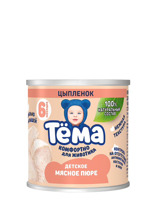 Натуральное мясное пюре из мяса цыпленка для детей с восьми месяцев. Обладает нежной текстурой и вкусом, комфортно для животика, проходит строгий контроль на отсутствие антибиотиков, косточек и жил.