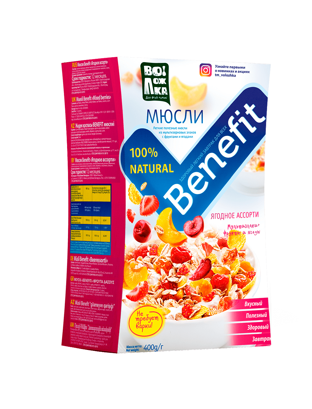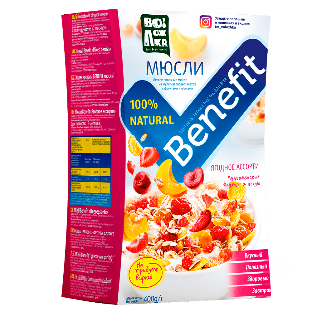 Хлопья овсяные, хлопья пшеничные, хлопья ячменные, хлопья ржаные, хлопья кукурузные (глазированные сахаром), изюм, абрикос, клубника, вишня
