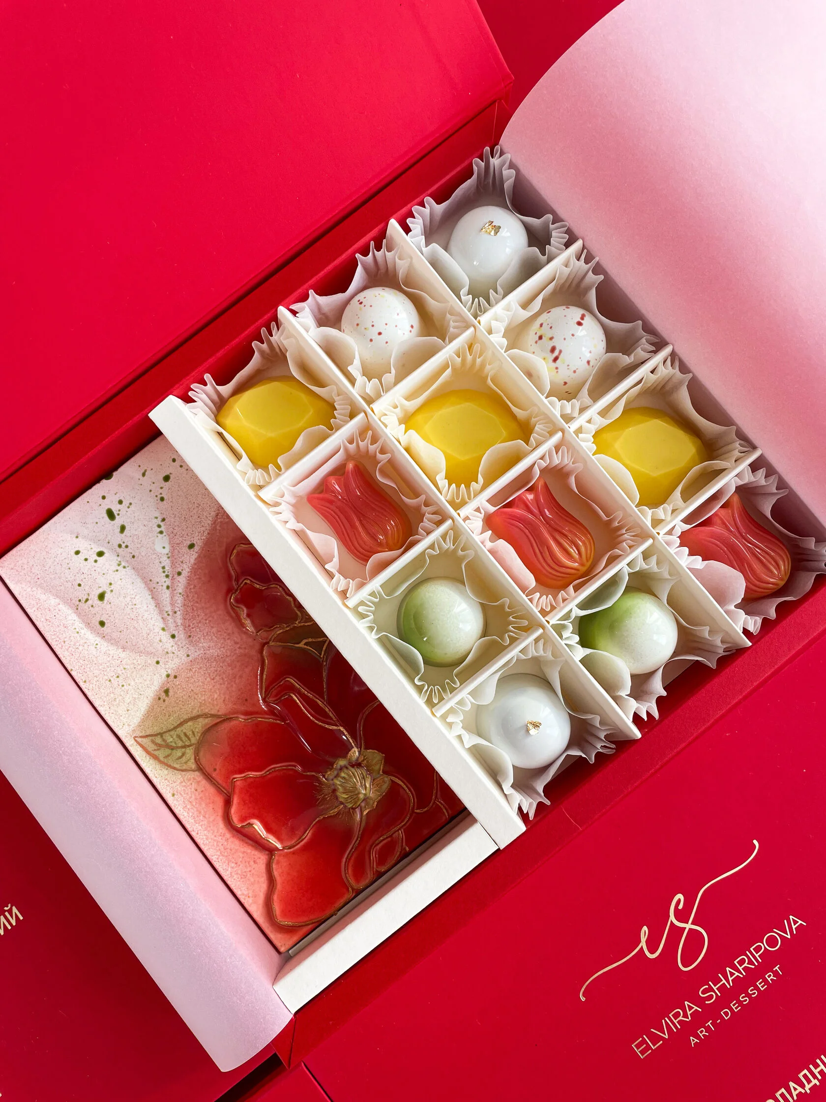 Конфеты в подарочной, брендированной коробке с золотым тиснением. Коробочка завязывается на ленты, что придает продукции праздничный вид. Дополнительно продукция упаковывается в красивые, брендированные пакеты, для защиты от внешней среды, удобства переноски и дополнительного презентабельного вида.