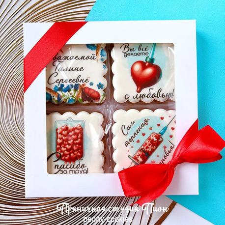 В наборе 4 пряника с ажурным краем, размер 1 пряника 8,5х8,5 см, каждый пряник упакован в индивидуальный пакет. Набор упаковывается в коробку размером 20х20 см, перевязан атласной лентой в тон.