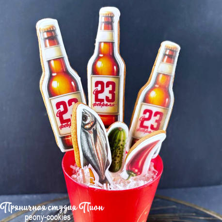 Оригинальный подарок мужчине на 23 февраля в виде букета в кашпо с пряничной едой - в этом букете набор из 3 бутылок пряничного пива, с надписью "с 23 февраля" (Надпись можно изменить), 1 рыбкой соленой, огурцом и перчиком. Размеры пряников небольшие, сам букет компактный.