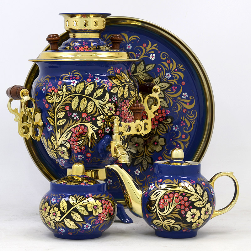 Оригинальный электрический самовар из серии «Вологодская хохлома» – ценная находка для почитателей самобытной культуры России и ценителей отменного чая. Выполненное в традиционной технике изделие – предмет гордости мастеров Тульского комбината. Электрический самовар – желанный участник семейного застолья. Набор отличается от классической хохломской техники росписи, для которой характерно сочетание черно-красной основы с золотом: здесь в качестве основы выступает необычный лазурный оттенок. Он дополнен традиционными для хохломы художественными элементами – ягодами, цветами и тонкими, ювелирно выполненными штрихами. Все элементы – самовар в форме жёлудь, поднос, сахарница и заварочный чайник – созданы из качественных материалов, фурнитура – из массива бука. Станьте обладателем уникального самовара от мастеров Тульского самоварного комбината! Сделайте заказ прямо сейчас – мы гарантируем качество используемых материалов (на каждое изделие даем гарантию 5 лет) и надежность доставки по всей стране. Получите настоящий тульский пряник в подарок!