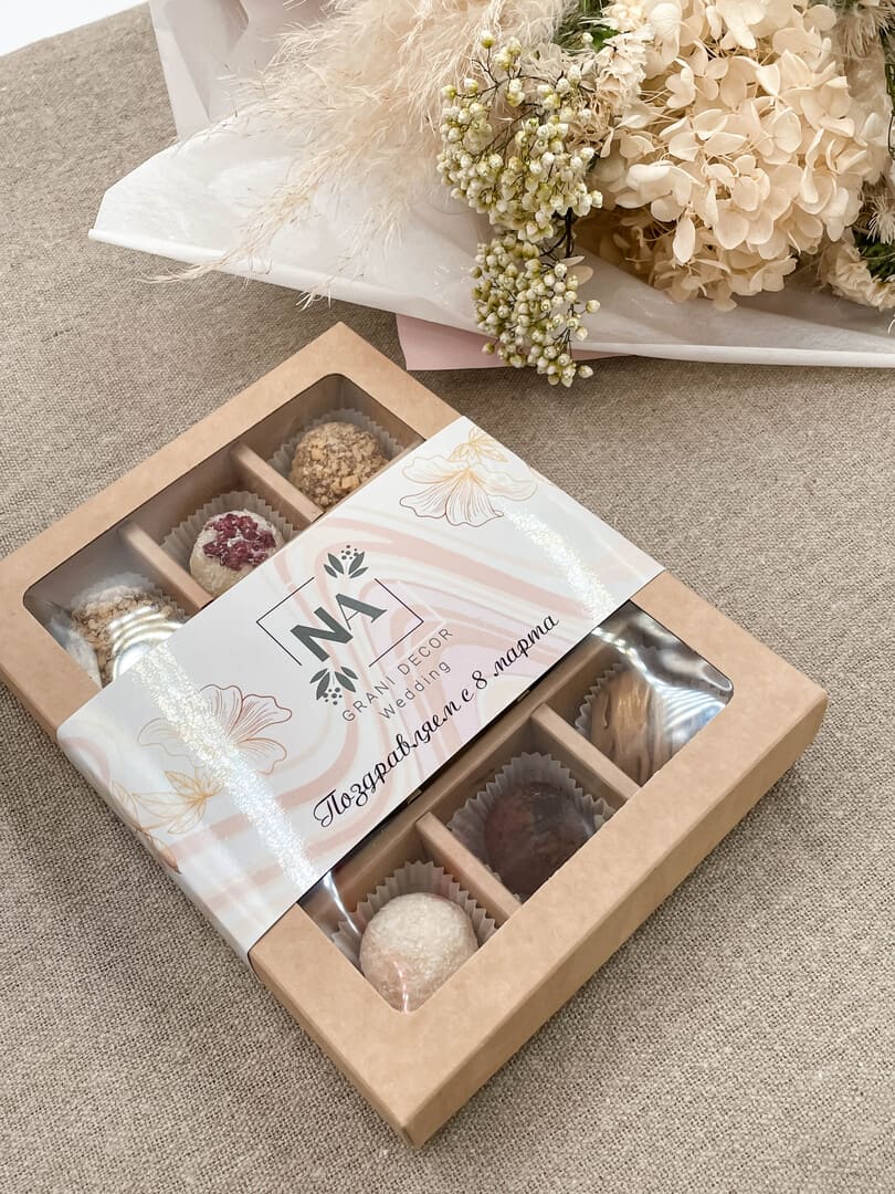 В коробку пенал, закрывающуюся крышкой с окном, вложены 12 шт. вкуснейших, натуральных конфет ручной работы. Коробка обёрнута в шубер с вашим логотипом.