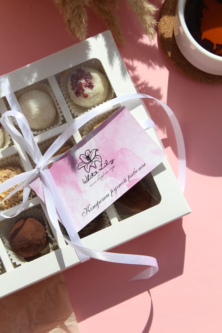 Наборы шоколадных трюфелей ручной работы 12 шт. с логотипом, лентой и биркой